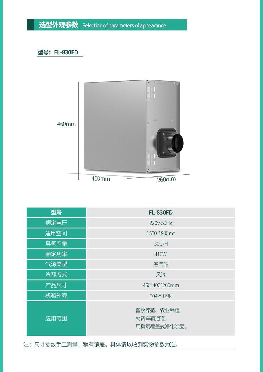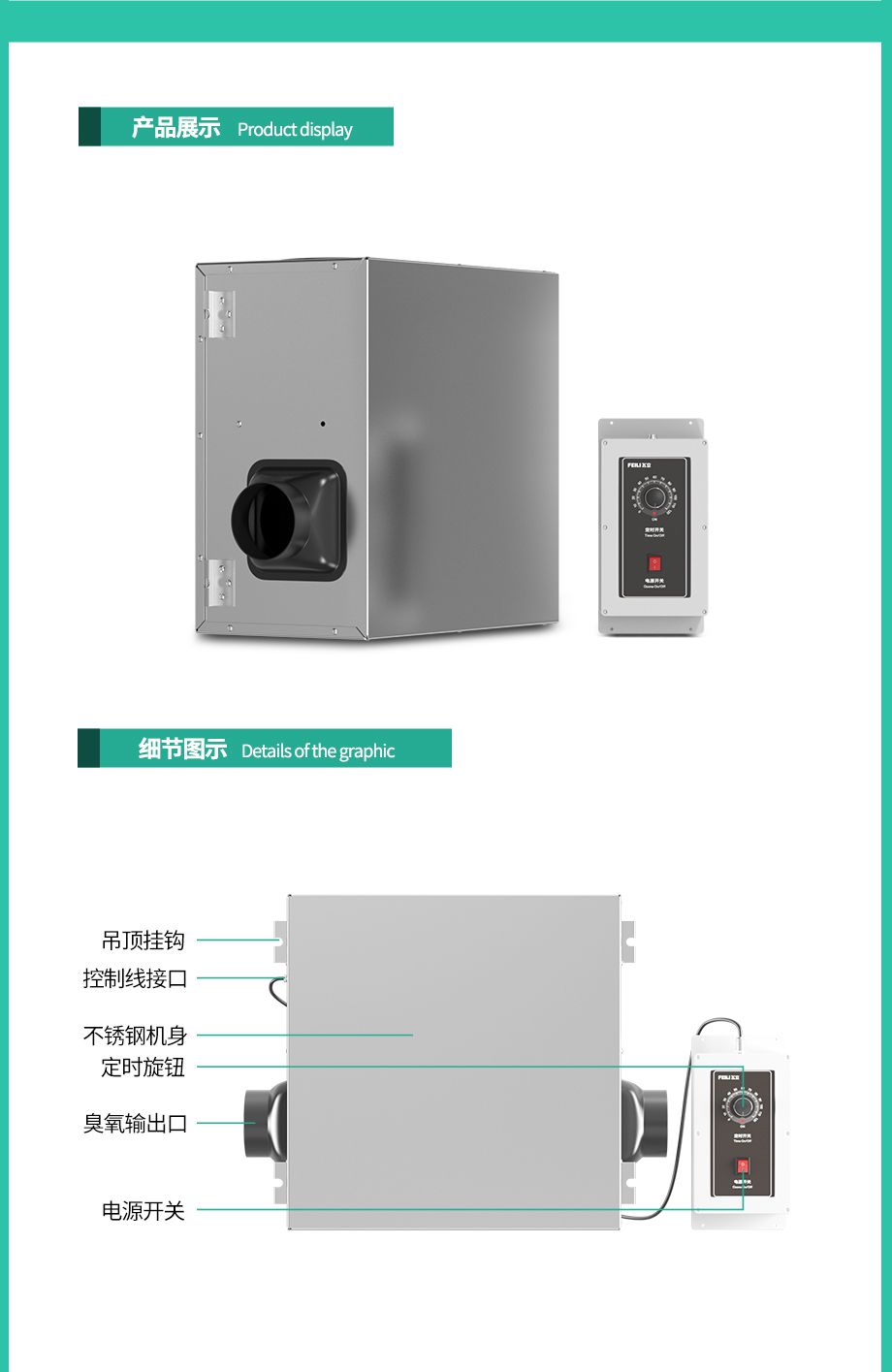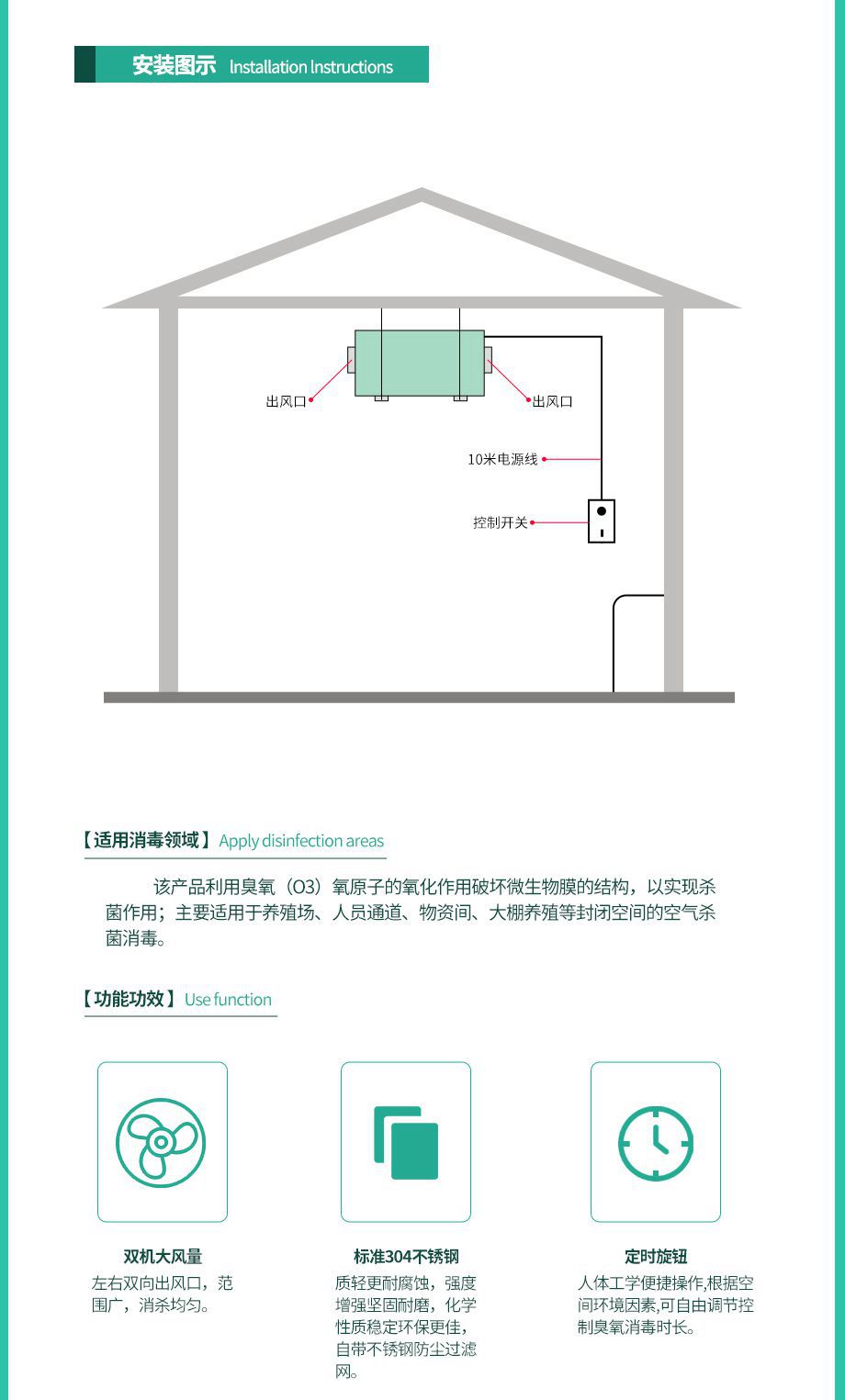 l 外置式微电脑控制(线10米),操作方便 。l 双机大风量,消杀均匀范围广 。l 空气循环制氧消毒,无耗材(一机多用 安装简易便捷。l 适用于养殖场 、人员通道 、物资间、大棚养殖、储物间及车辆通道等场所。 l 机身采用304加厚不锈钢材质,防腐蚀、抗氧化 。l 臭氧发单元由3mm合金片+陶瓷组合构成,蜂窝式放电设计,臭氧浓度高,寿命长且抗震防摔性极强。