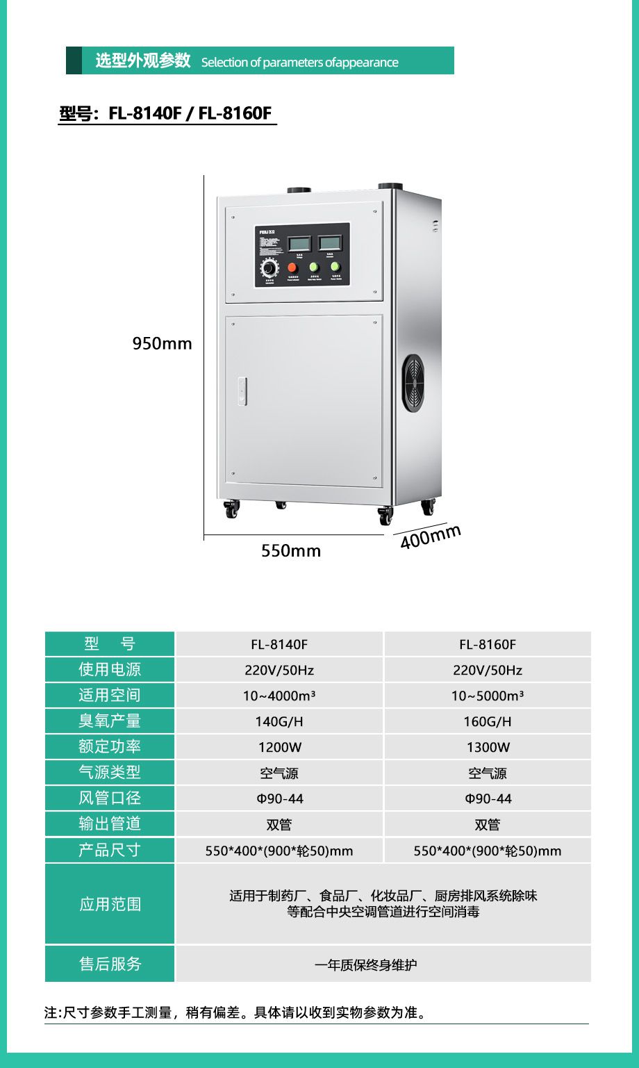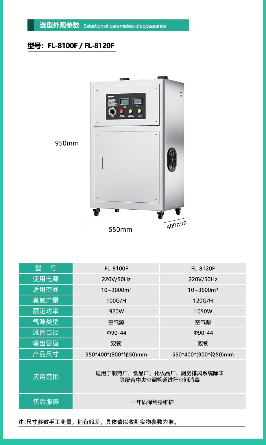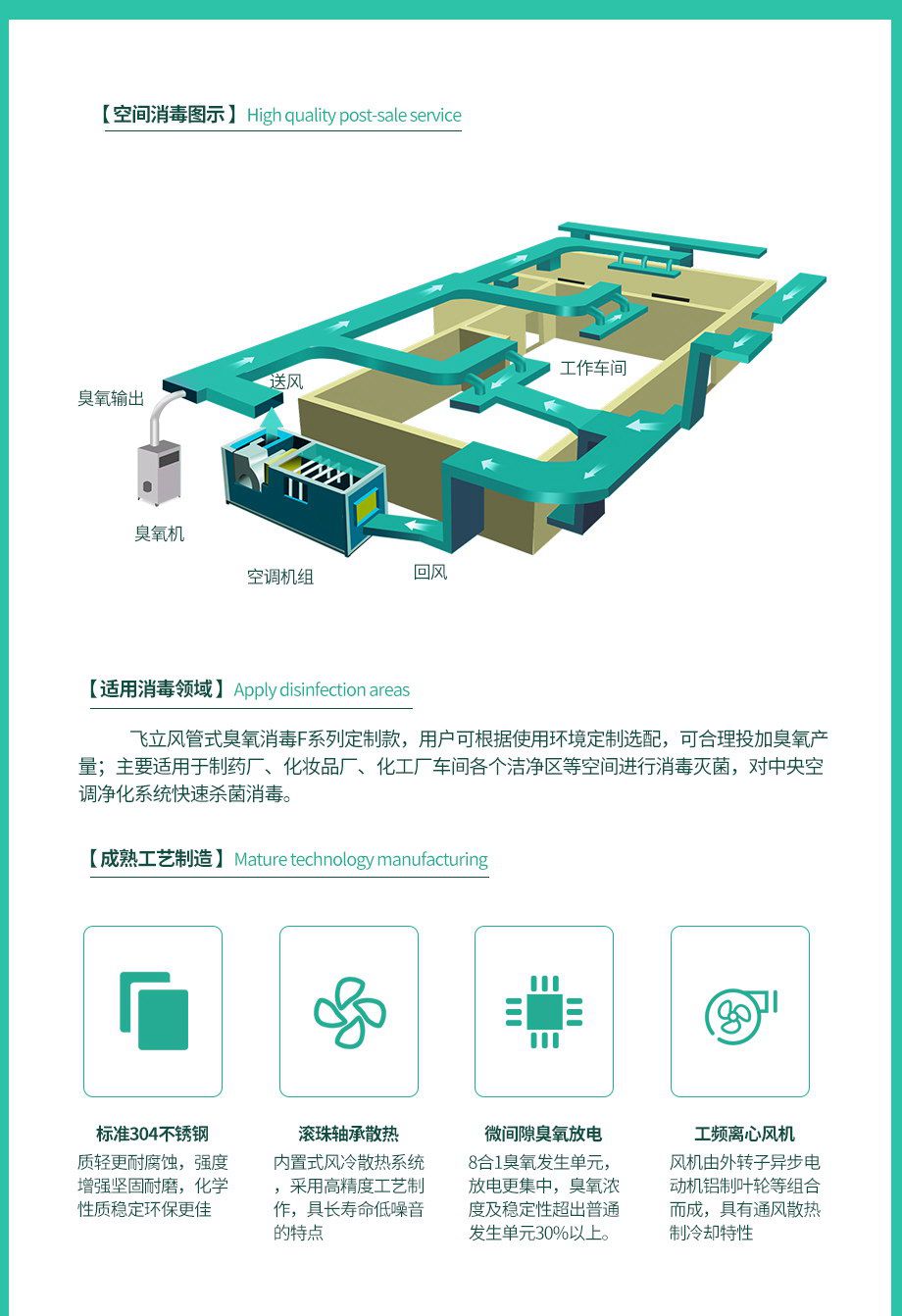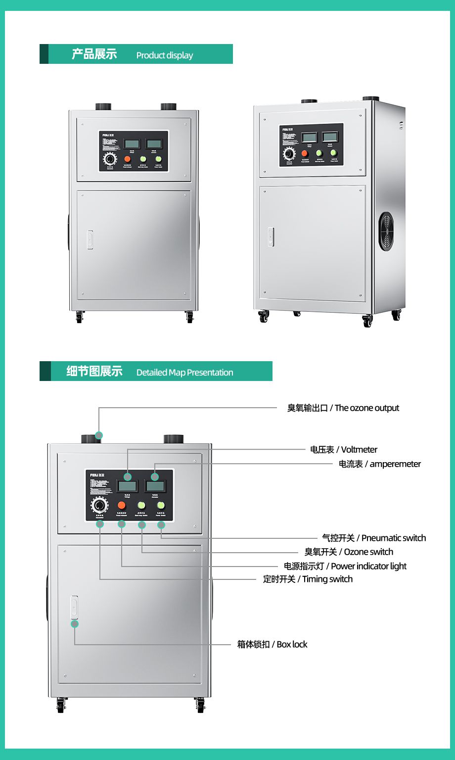 国际知名质量认证拥有国际CE认证书,可出口欧盟多国,质量达出口标准1.管道式臭氧输出设计,出风口直径90mm,可连接中央空调送风管道将臭氧输送至空间消毒。2.采用八合一微间隙放电技术,放电均匀稳定,释放臭氧浓度高,使用寿命。3.采用大功率离心风机,风量大且投送距离远。支持大空间布管,消毒更均同。4.304不锈钢柜式机箱设计,机箱柜门式设计,方便打开机箱内部有助于机器内部保养。5.臭氧浓度可根据使用需求自由调节。6.机器采用风冷冷却系统,通电即可,无需耗材,安装操作简单快捷。