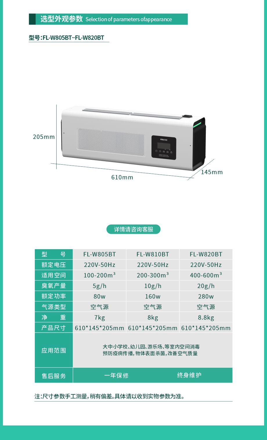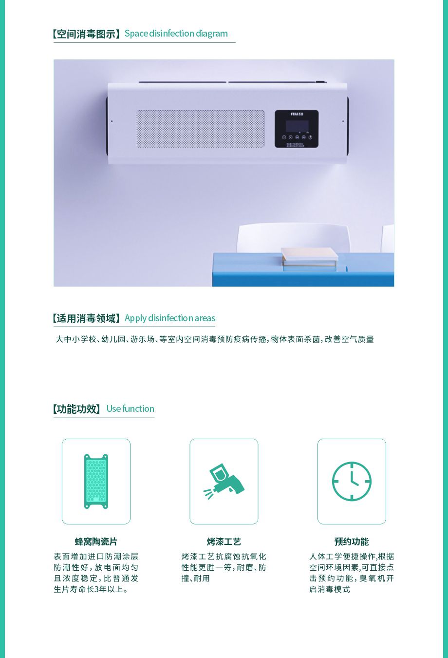 l 学校、幼儿园、诊所、酒店、KTV包厢、等空间或物品消毒。l 食品加工、包装材料、无菌室消毒杀菌。l 壁挂式外观设计,WiFi智能定时,根据设计时间自动开关机,循环工作无需重复设定。l 采用陶瓷发生单元,微间隙放电技术,放电频率高且稳定,臭氧浓度15-25mg/L。l 机身采用汽车烤漆工艺,防腐蚀、抗氧化。l 采用滚珠轴承散热风扇,转速提高20%,散热功能更强。