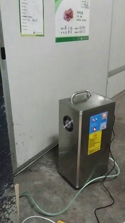 机器特点:本机属于移动式,安装于冻库外面的位置,通过臭氧出口接送气管将臭氧送入冻库里,接上电源即可使用。
